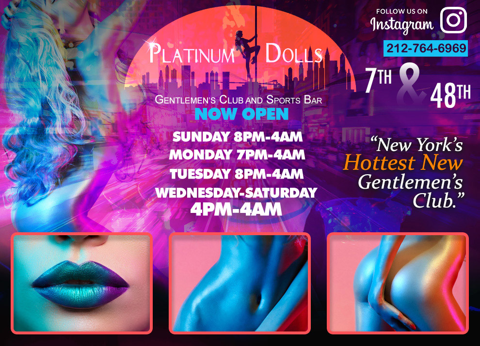 WE ARE OPEN 7 DAYS A WEEK! MONDAY 7:00 PM-4:00 AM INTERESTED IN DANCING AT PLATINUM DOLLS? Welcome to Platinum Dolls, The Hottest Gentlemen’s Club and Sports Bar in New York City. Located in the heart of Time Square Platinum Dolls Gentlemen's Club and Sports Bar is New York's finest. Platinum Dolls Gentlemen's Club and Sports Bar DISCLAIMER: The Stock Photography Models portrayed on this website do not work at Platinum Dolls Gentlemen's Club and Sports Bar and are for illustrative purposes only. The Models do not personally endorse Platinum Dolls Gentlemen's Club and Sports Bar. The models are simply used on this website to portray types of beautiful girls that do work at Platinum Dolls. The context in which the photographs are used on this website is not intended to reflect personally on any of the Models shown in the photographs. We do not mean to imply, in any form, a working employment between the models pictured and Platinum Dolls. CONTACT US VIA EMAIL | CONTACT US BY PHONE 212-764-6969 2024 |